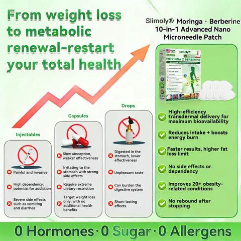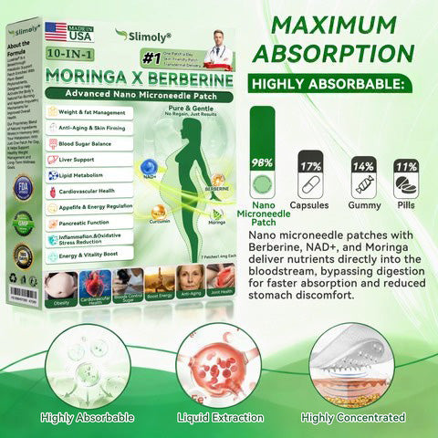 Slimoly® 𝑴𝒐𝒓𝒊𝒏𝒈𝒂 · 𝑩𝒆𝒓𝒃𝒆𝒓𝒊𝒏𝒆 × 𝑵𝑨𝑫+ 10-𝒊𝒏-1 𝑨𝒅𝒗𝒂𝒏𝒄𝒆𝒅 𝑵𝒂𝒏𝒐 𝑴𝒊𝒄𝒓𝒐𝒏𝒆𝒆𝒅𝒍𝒆 𝑷𝒂𝒕𝒄𝒉 is developed through 20+ years of research by over 30 experts and designed for all adults and body types. Powered by Berberine and natural extracts, this nano microneedle patch delivers active ingredients through the skin to support healthy blood sugar balance, appetite control, and fat metabolism for gradual, sustainable weight management — no pills or injections required. Enriched with Collagen Peptides, it helps maintain skin firmness during slimming while also supporting digestion, gut and women’s health, energy levels, fatigue reduction, and overall metabolic balance. Manufactured in GMP-certified facilities under U.S. and EU standards, it offers a safe, science-backed, needle-free solution for effective weight control and daily wellness.