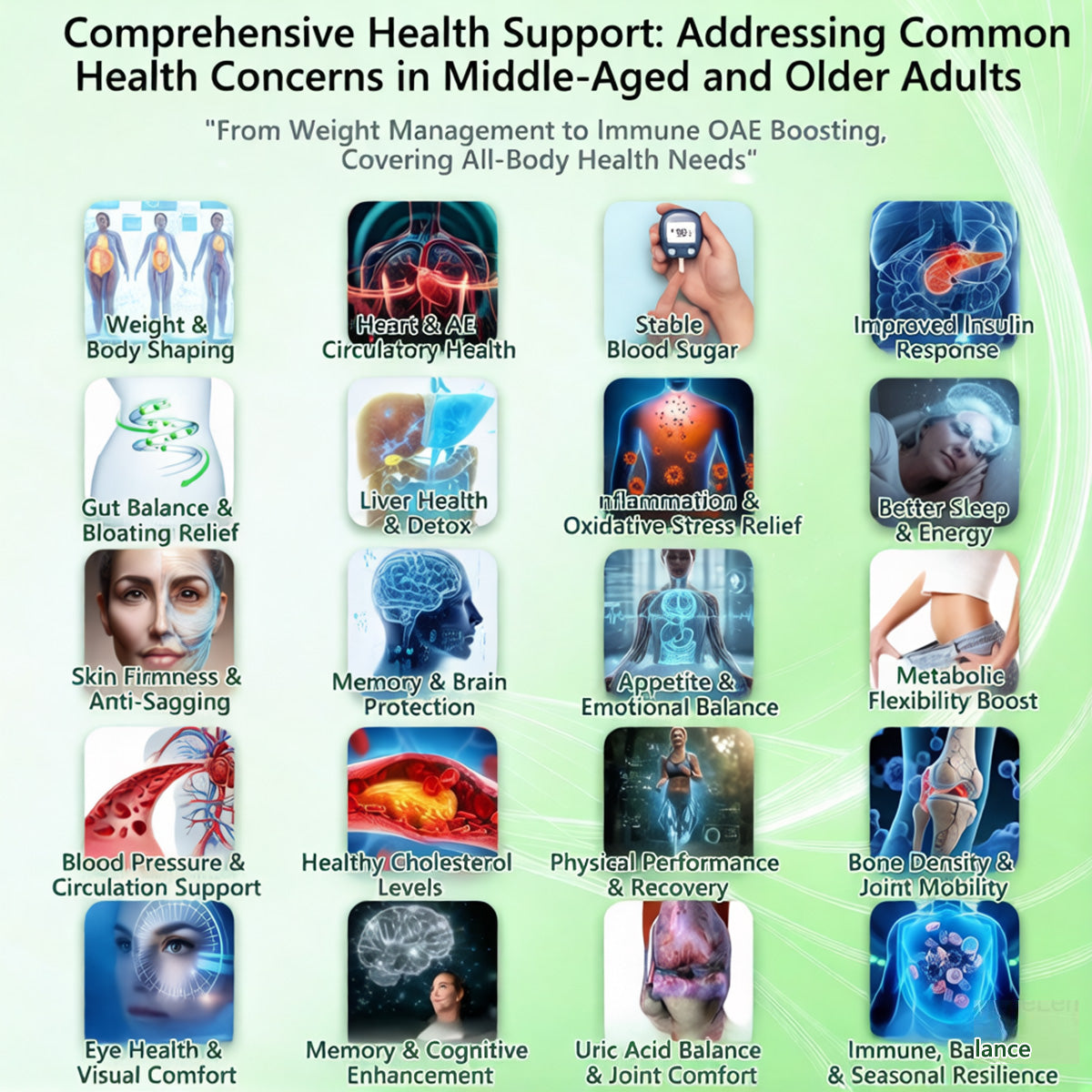 With aging, stress, and a fast-paced lifestyle, many people experience mood swings, anxiety, insomnia, memory decline, and brain fog from blood sugar fluctuations, inflammation, low energy, and nervous system overload. For women, menopause can further intensify hot flashes, mood instability, and poor sleep. To address this, key ingredients work together: Ashwagandha lowers stress hormones and improves sleep; Magnesium calms the nervous system; Omega-3 and Ginkgo Biloba protect neurons and boost focus; NAD+/NMN restore brain energy. Clinical data show that in 2–4 weeks, over 85% improved mood and sleep; in 4–6 weeks, about 80% saw better memory and less brain fog; and over 79% of women reported menopause symptom relief. Overall, this combination stabilizes mood, restores brainpower, and keeps the mind clear and focused.
