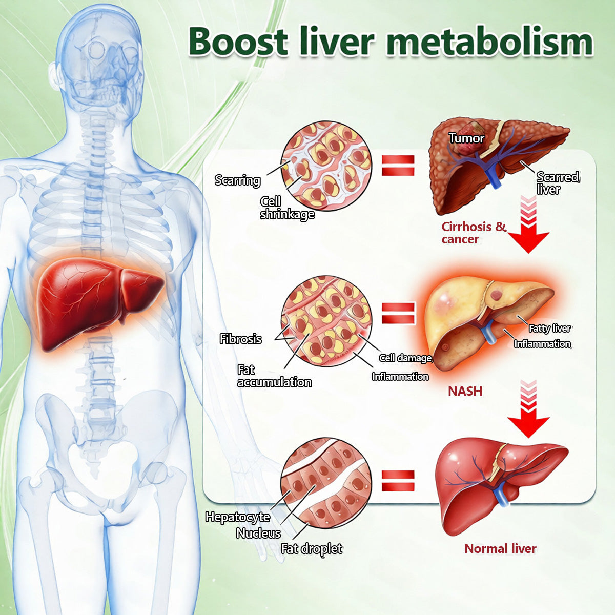 - Fatty liver: Can lead to fatty liver disease, which may progress to liver dysfunction, cirrhosis, or require liver transplant.